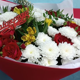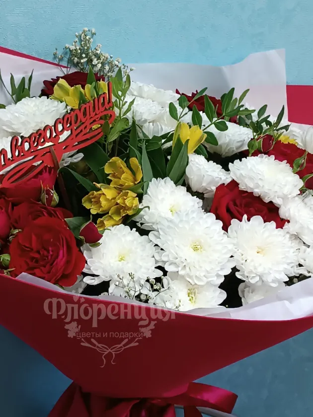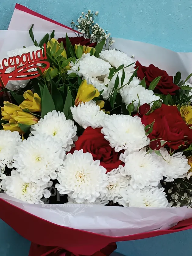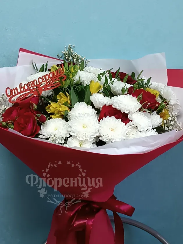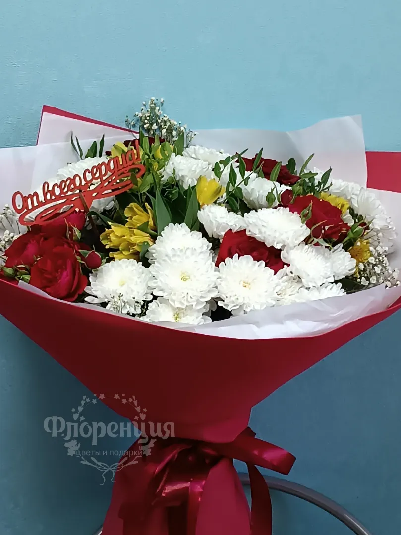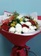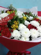 Сборный букет из кустовой хризантемы, роз и альстромерии