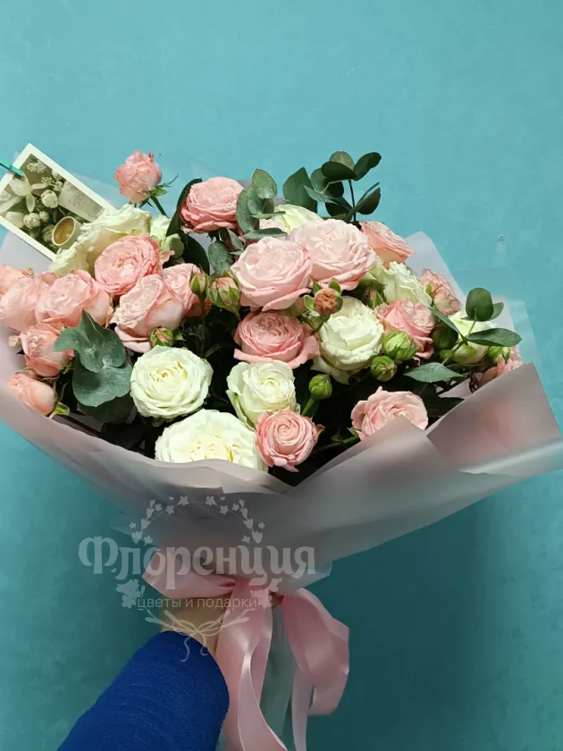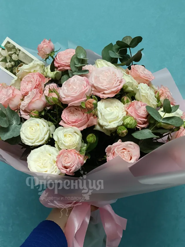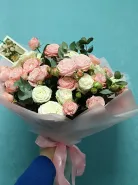 Нежный букет с розовыми и белыми розами, дополненный свежей зеленью, станет прекрасным подарком для самых дорогих людей. Воздушная упаковка и атласная лента придают композиции лёгкость и элегантность. Этот букет - идеальный способ выразить свою любовь и признательность.