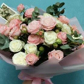Нежный букет с розовыми и белыми розами, дополненный свежей зеленью, станет прекрасным подарком для самых дорогих людей. Воздушная упаковка и атласная лента придают композиции лёгкость и элегантность. Этот букет - идеальный способ выразить свою любовь и признательность.