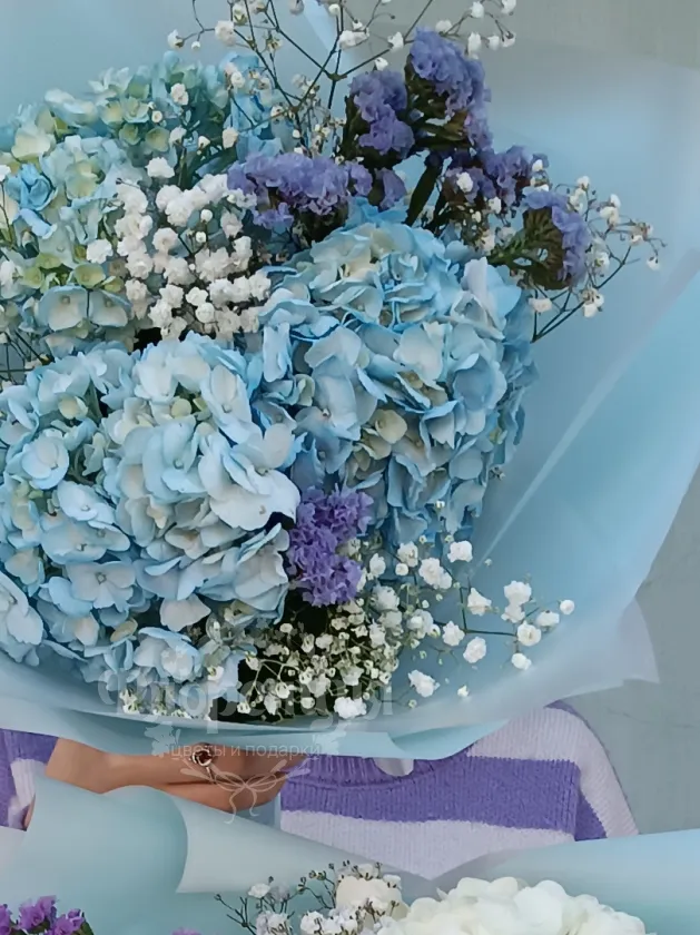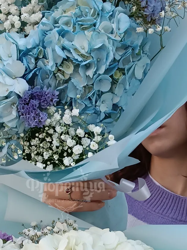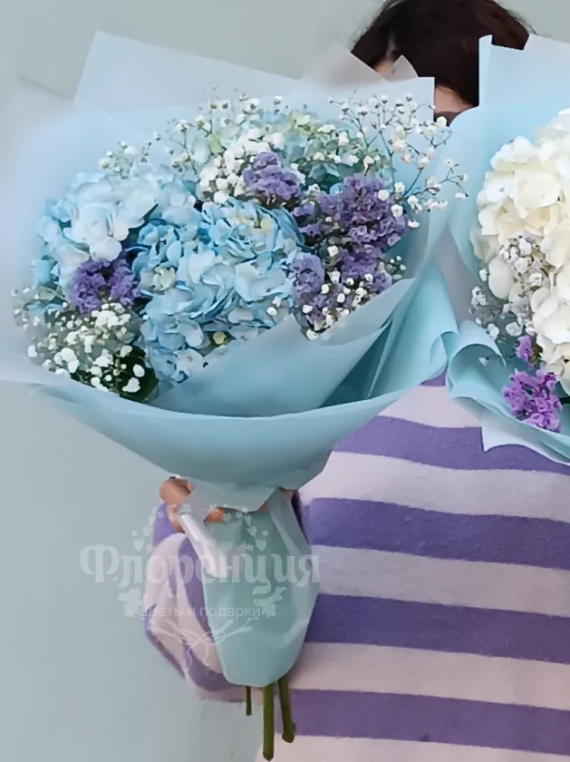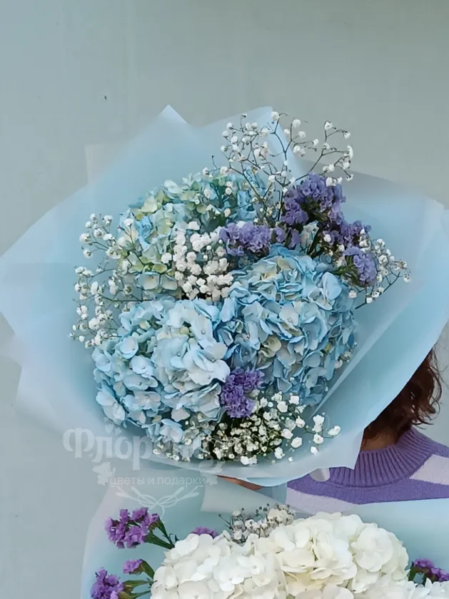 Сборный букет с гортензией и гипсофилой в воздушной упаковке.