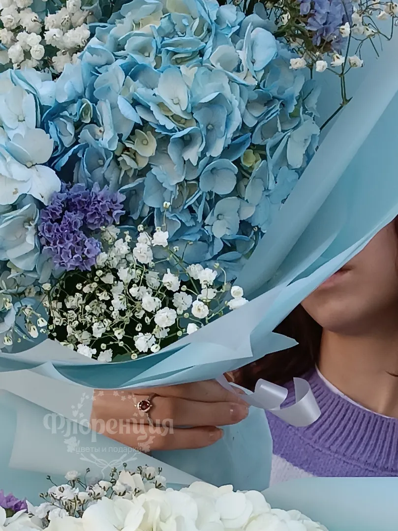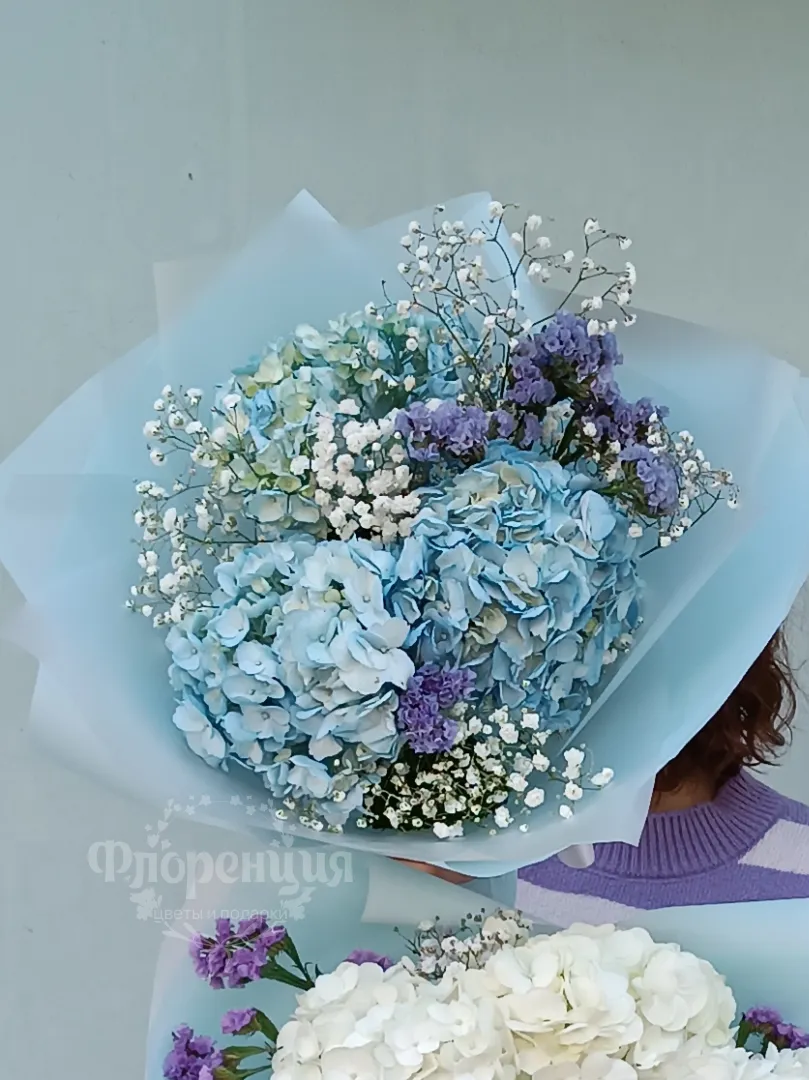 Сборный букет с гортензией и гипсофилой в воздушной упаковке.