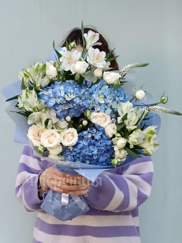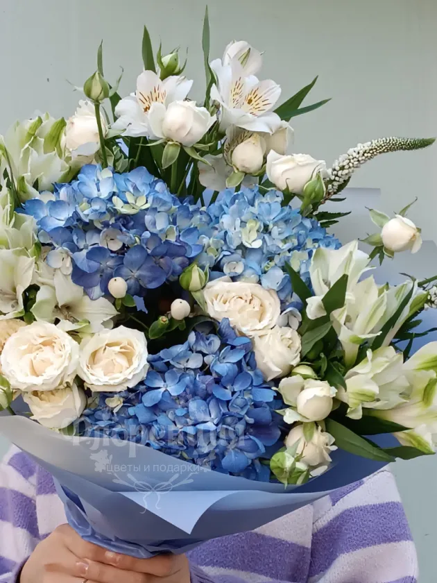 Сборный букет в бело-голубой гамме. В составе стойкая гортензия, кустовые розы и альстромерия.