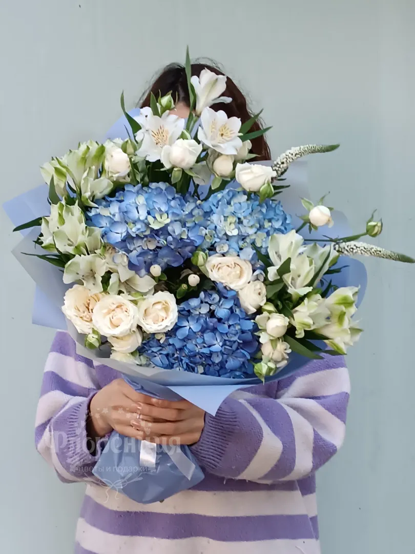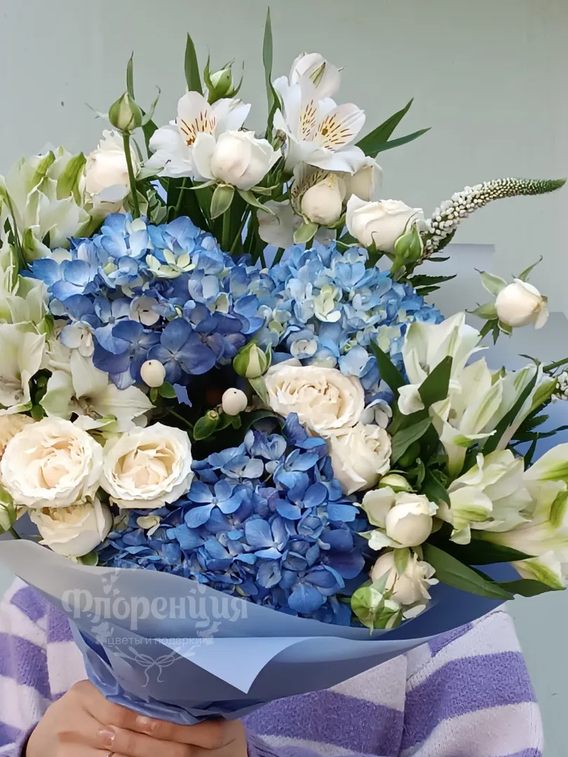 Сборный букет в бело-голубой гамме. В составе стойкая гортензия, кустовые розы и альстромерия.