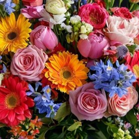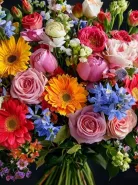 Очаровательный букет, собравший в себе все краски лета! Яркие герберы, нежные розы и полевые цветы создают неповторимую композицию, наполненную теплом и радостью.