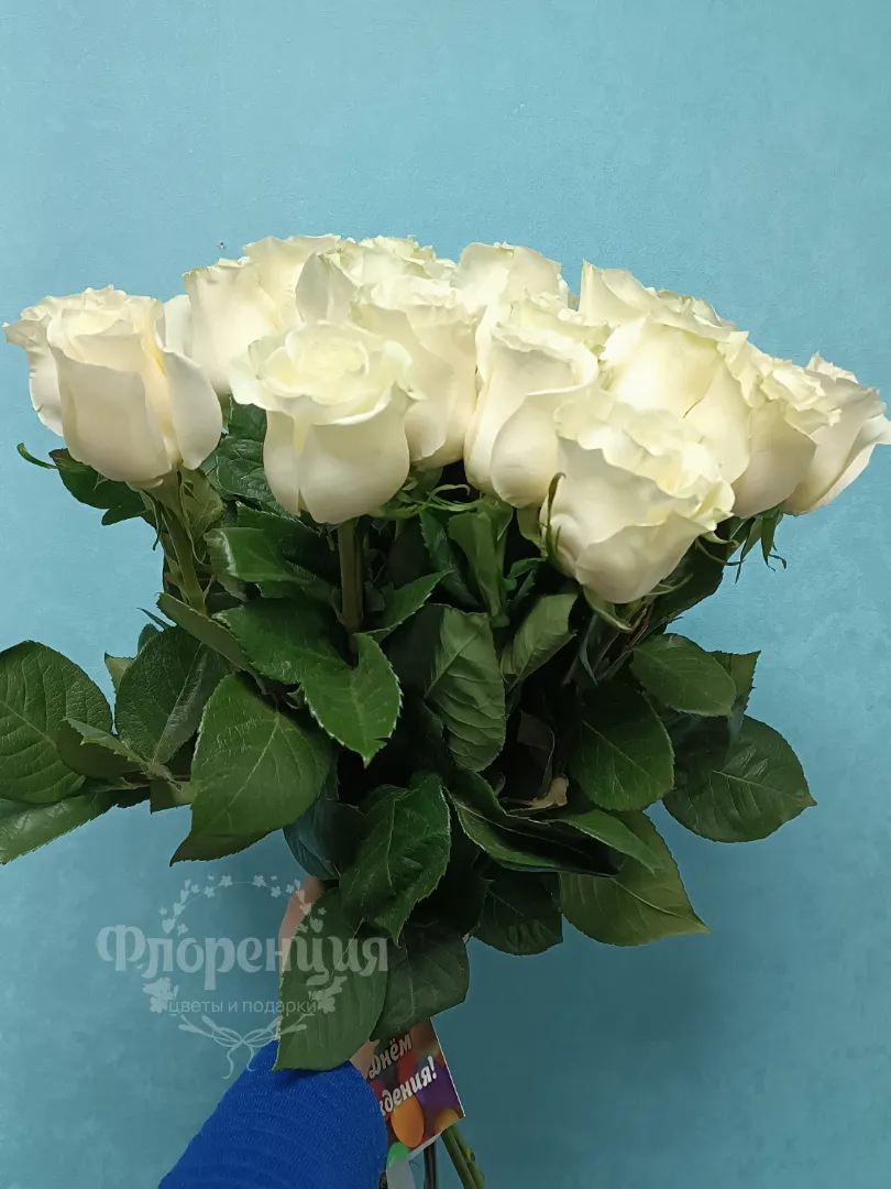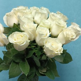 Букет из нежных белых роз олицетворение элегантности и чистоты. Соцветия, окруженные свежими зелеными листьями, создают объемную композицию. Букет станет прекрасным подарком для самых дорогих и близких людей.